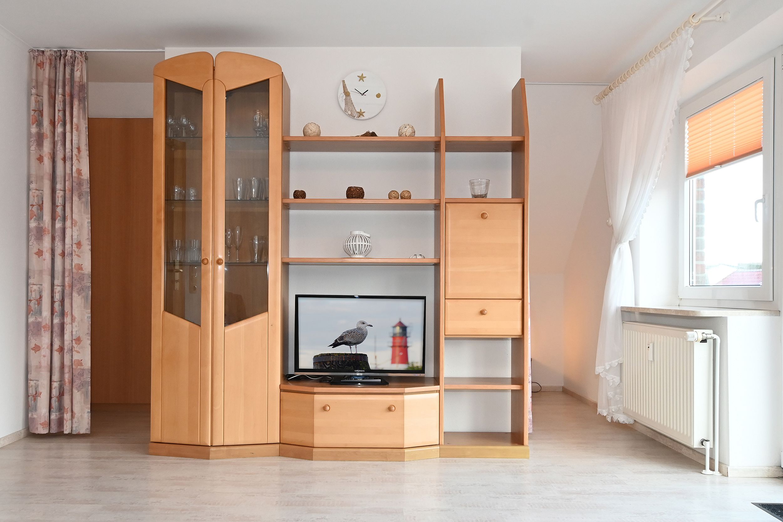 Die helle Wohnung zeichnet sich durch ihre liebevolle und behagliche Einrichtung aus. Von dem Flur aus gelangt man zum sonnigen Wohnzimmer mit Balkon.